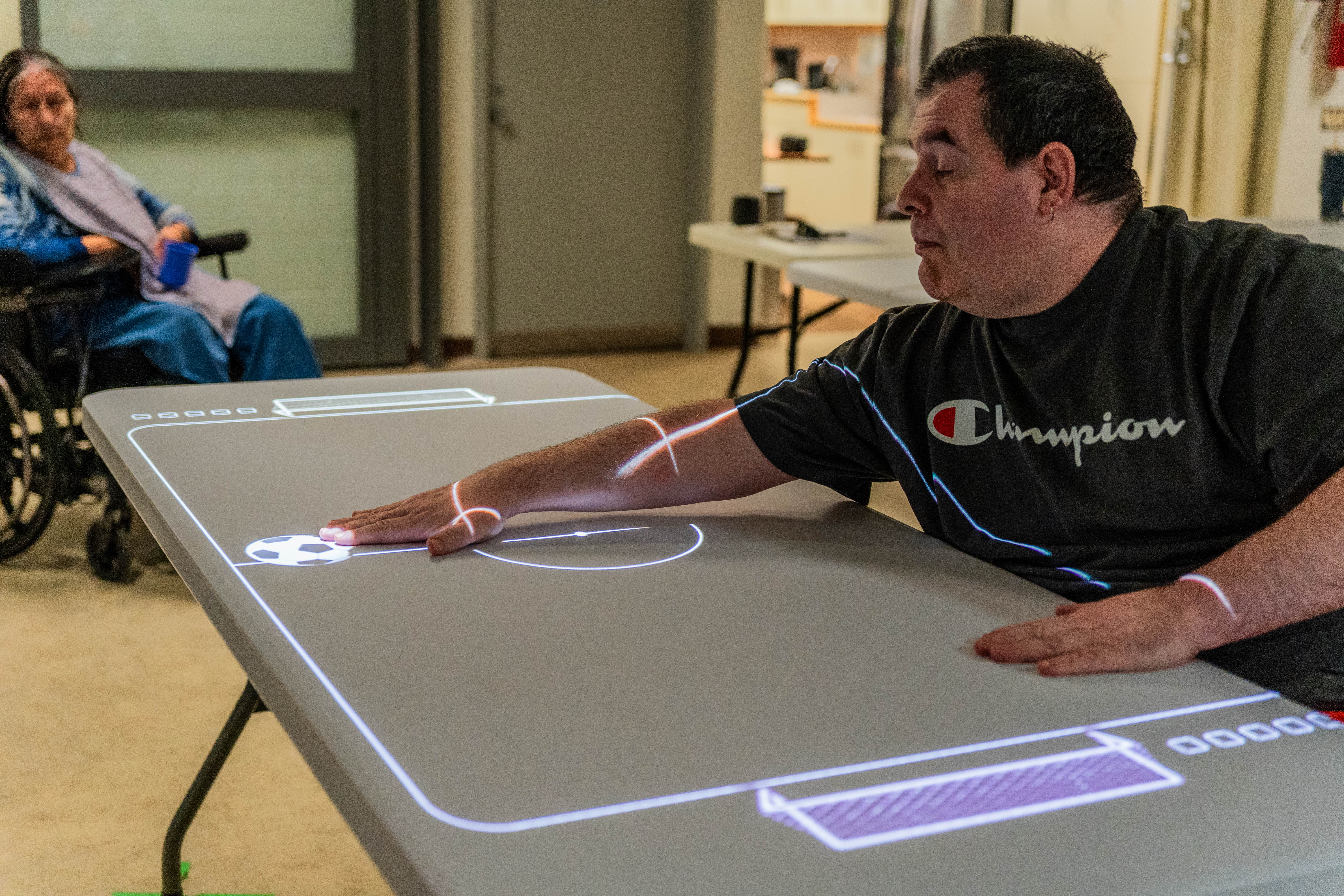 Tovertafel is a ceiling-mounted projector that projects light onto a table, providing the opportunity to engage multiple players simultaneously. Users decide which games and difficulty levels they would like to play, choosing between various cognitive, physical, social or sensory-focused games. Shauna Kessler, a rec therapist at Kipnes, still recalls how residents excitedly crowded the Tover table during its first day, eager to take their turn playing the games.